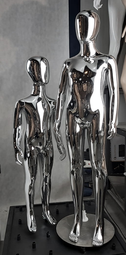 Manekin wykonane są z polipropylenu i pokryte warstwą chromu o lustrzanym połysku.